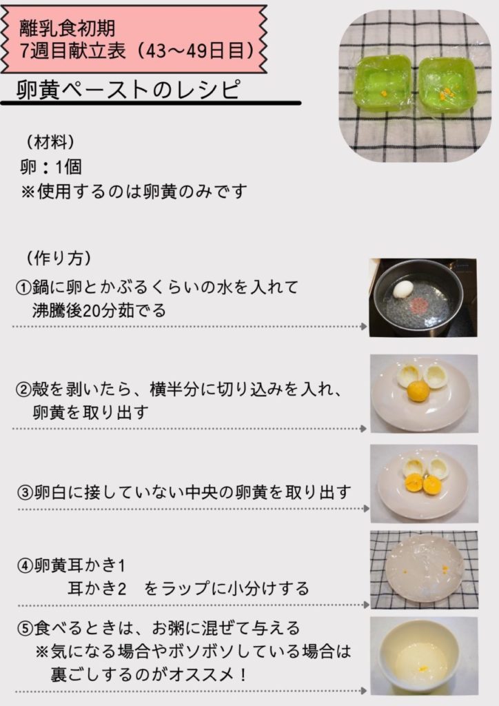 ※卵黄はアレルギーを起こしやすい食材のため、耳かき1から少しずつ量を増やしていきます。