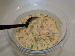 ニラ・長ねぎ・豚ひき肉を加え、全体がなじむまで混ぜる