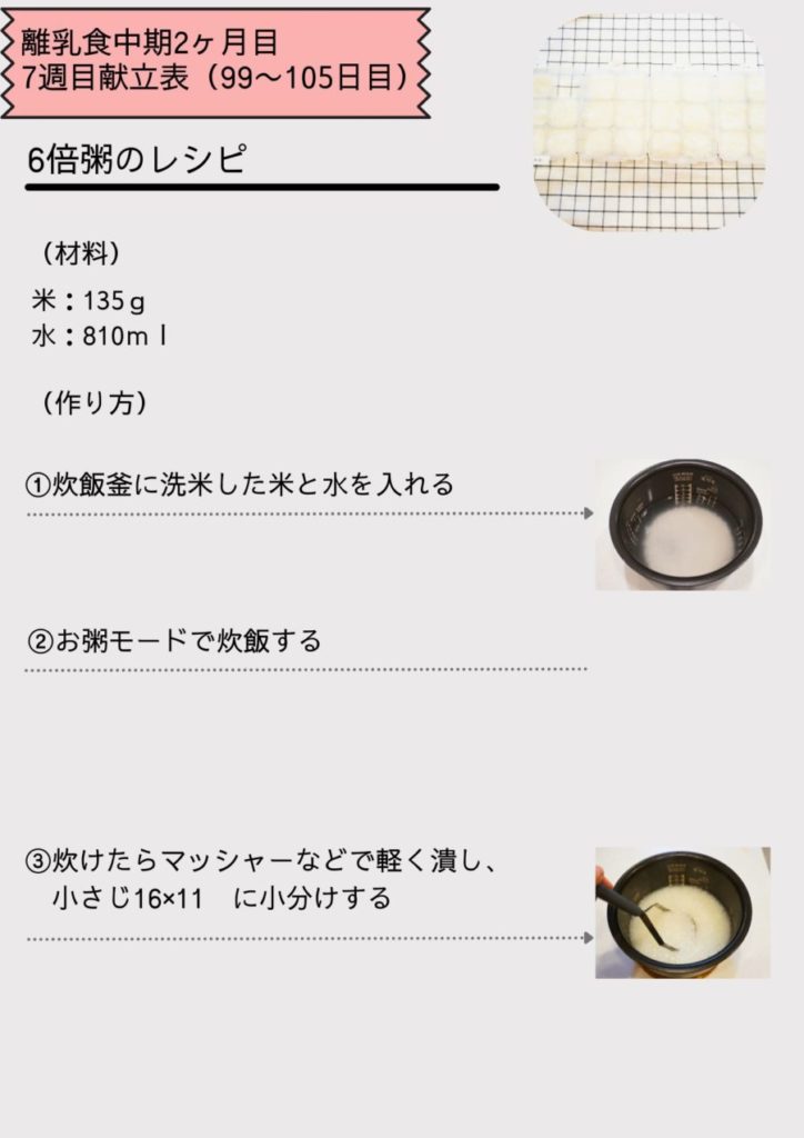 - お粥は「6倍粥」。粒の大きさを少しずつ大きくします