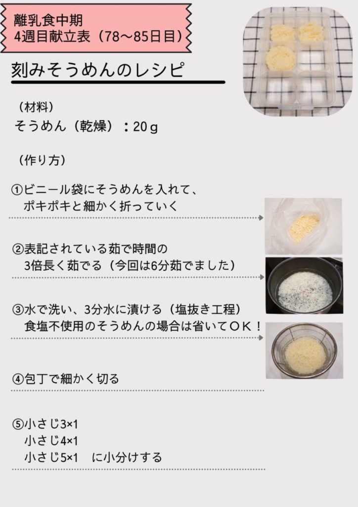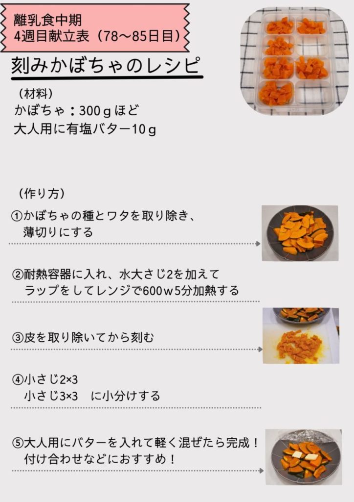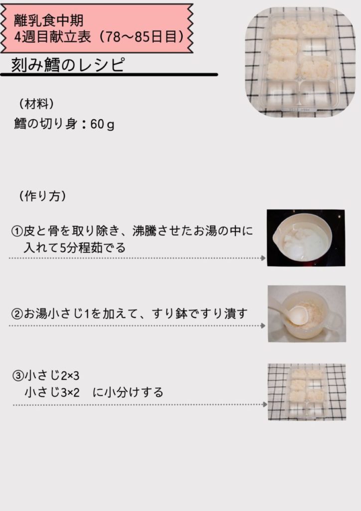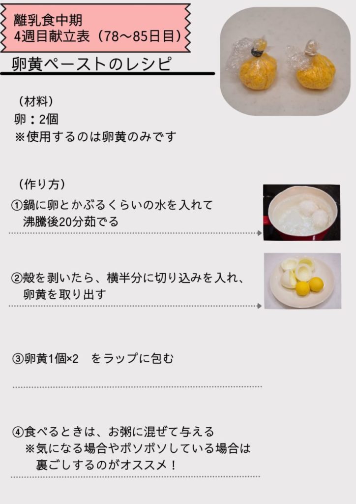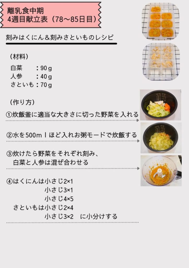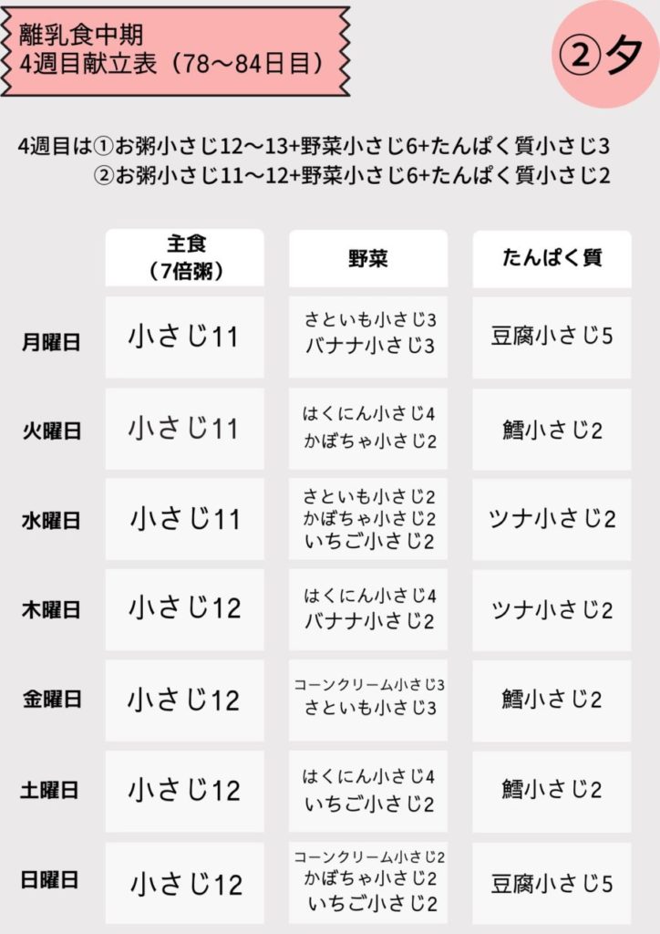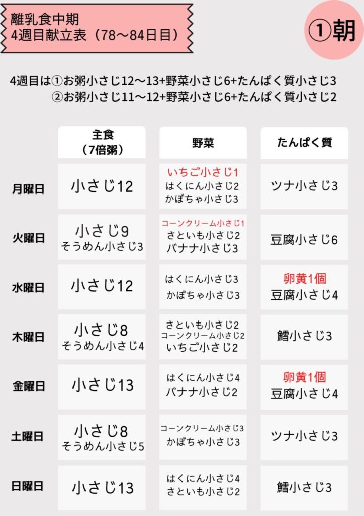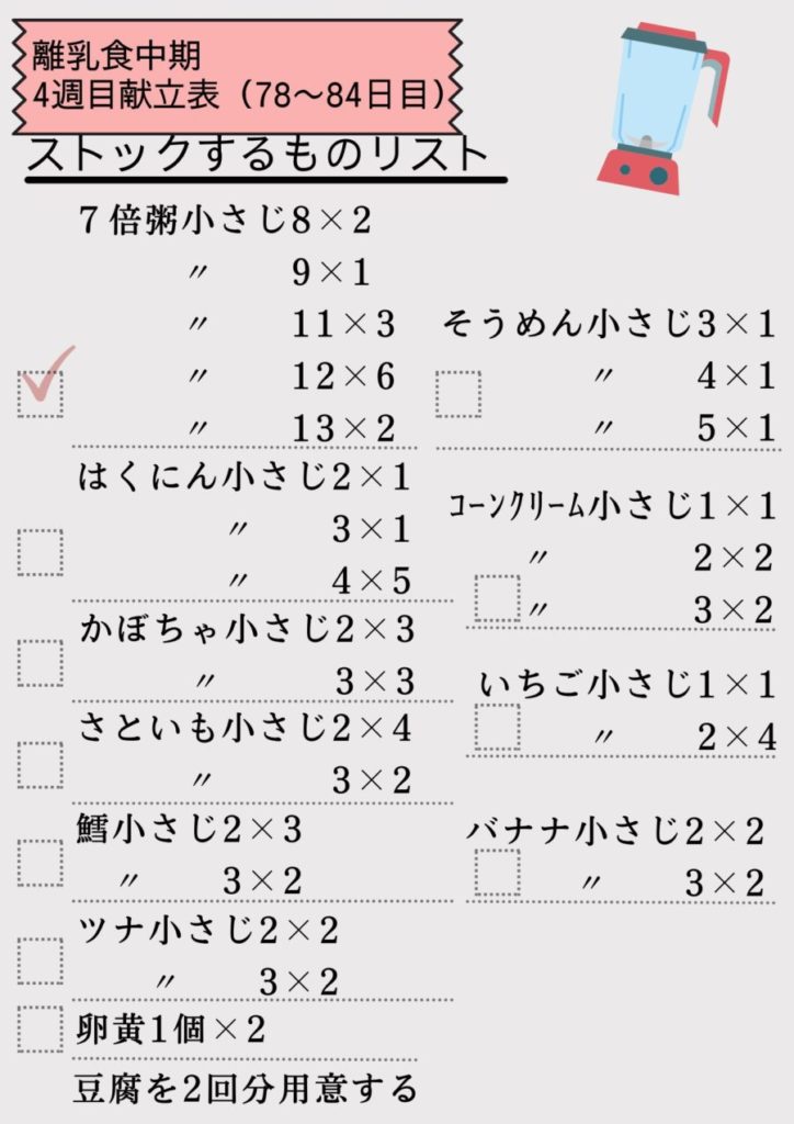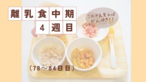 このページでは、離乳食中期・4週目(78〜84日目)の献立表と冷凍ストックレシピを、わかりやすくまとめました。