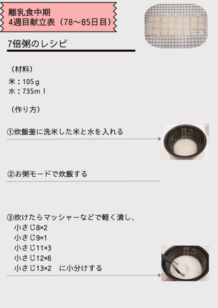 - 主食は7倍粥を中心に、徐々に粒を残した状態にしていきます