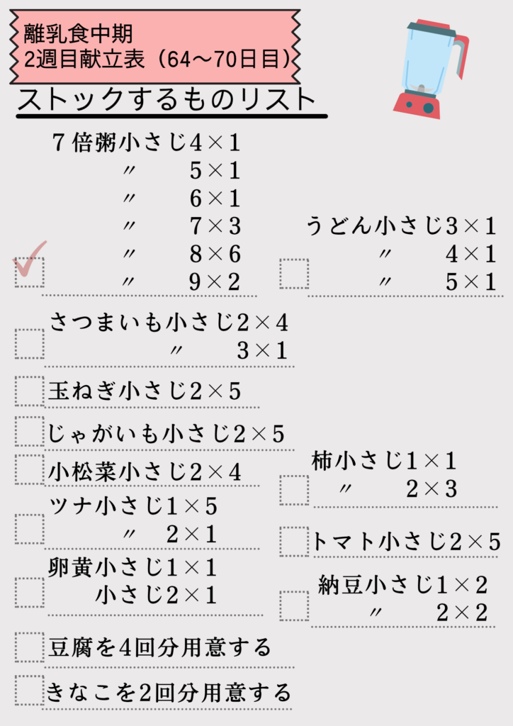 このページでは、離乳食中期・2週目(64〜70日目)の献立表と冷凍ストックレシピを、わかりやすくまとめました。