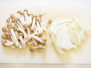 しめじは石づきを取ってほぐし、玉ねぎは薄切りにする